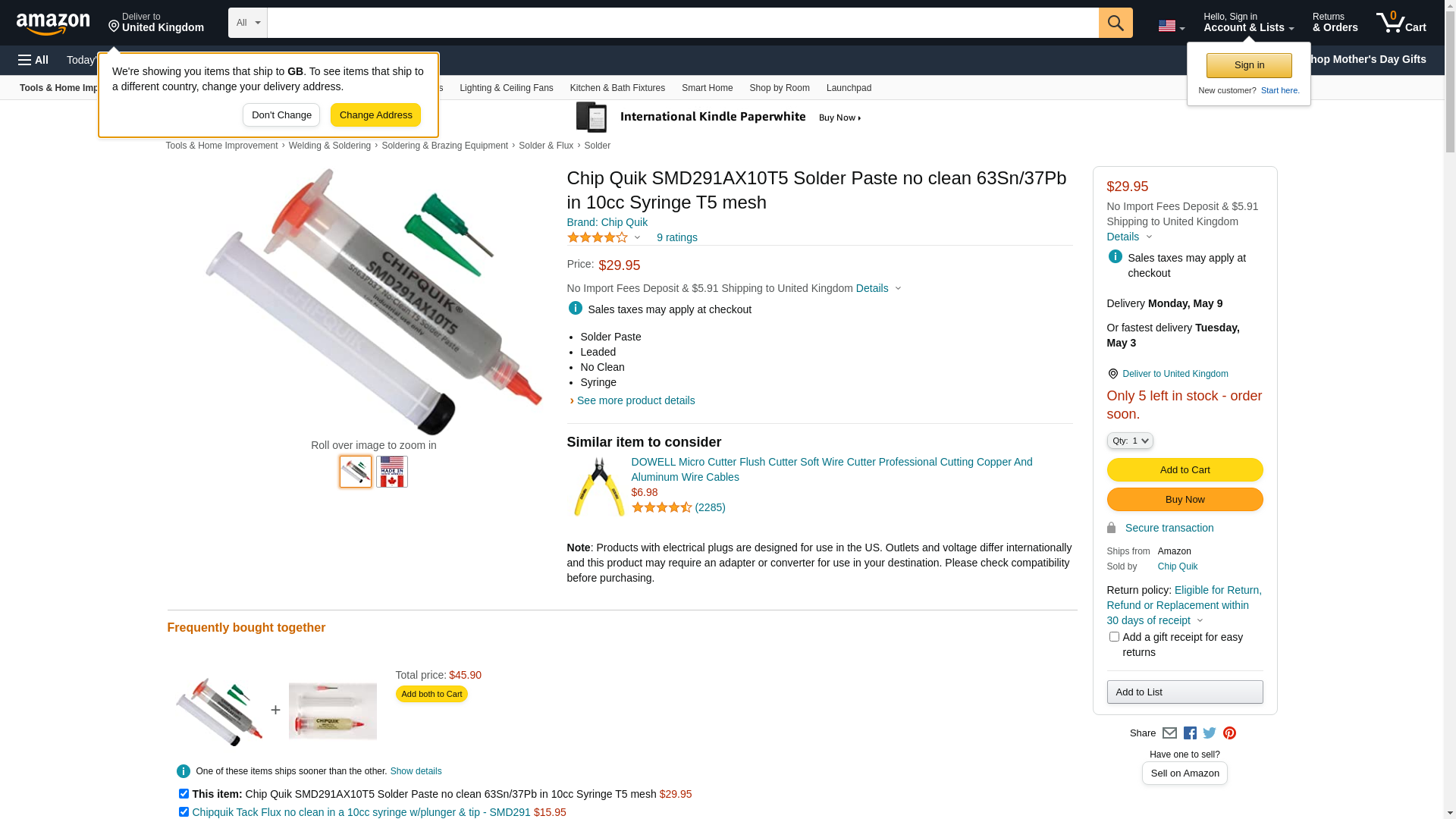 SMD291AX10T5 Chip Quik Solder Paste no clean 63Sn/37Pb in 10cc syringe 35g (T5)