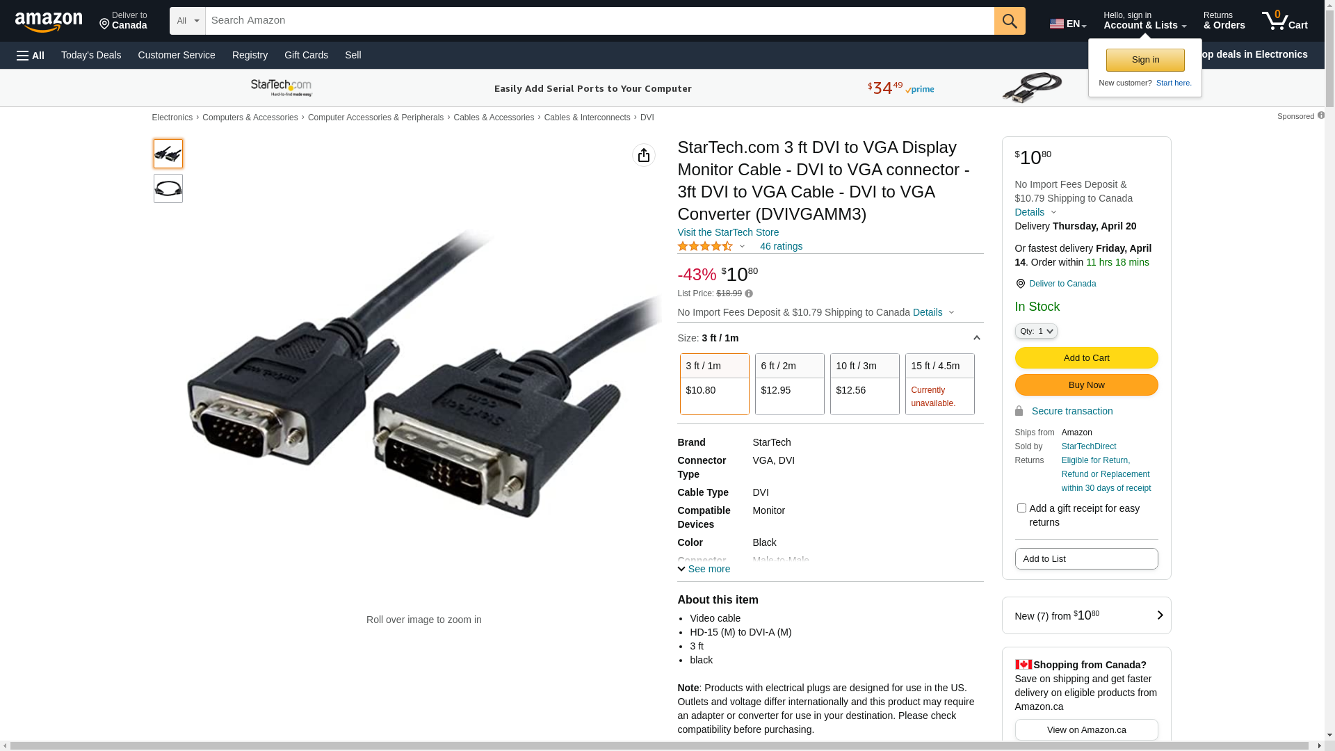 3' Black DVI to VGA cable effectively routes video signal from analog video card to analog DVI monitor. Startech 3' DVI To VGA Male/Male Display Monitor Cable, Black. 3' cable for convenient usage. DVI-A (17 pin) male to VGA (15 pin, high density D-Sub) male connector for effective connection. Comes in black color for enhanced look. Has a wire gauge 28 AWG for high conductivity. Offers molded connector ends with strain relief for easy connectivity. Meets RoHS certifications and standards. Includes 1 x 3' DVI to VGA display monitor cable. Connects PC/Mac with DVI analog video card to an analog or dual-mode flat panel display. Weighs 4.4 oz. Comes with limited lifetime warranty.