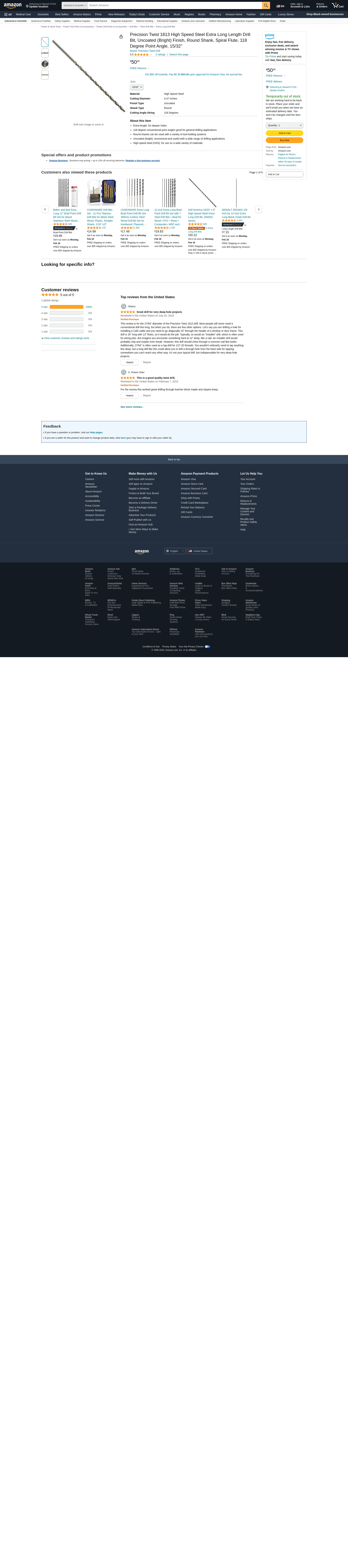Precision Twist 1813 High Speed Steel Extra Long Length Drill Bit, Uncoated (Bright) Finish, Round Shank, Spiral Flute, 118 Degree Point Angle, 15/32"