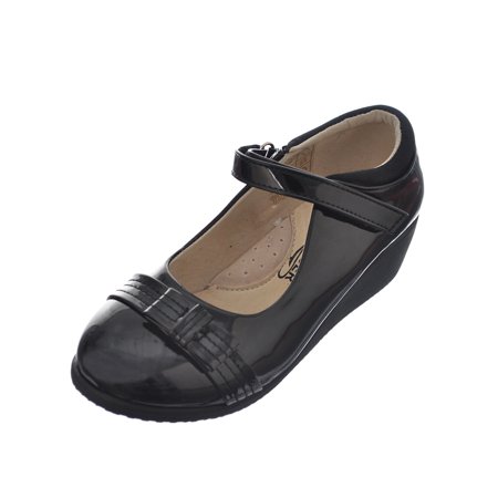 <ul> <li>Easy Strider Mary Janes</li> <li>Faux patent leather construction</li> <li>Stitched band with bow accent at toe</li> <li>Adjustable hook-and-loop ankle strap</li> <li>Padded cuff</li> </ul>
