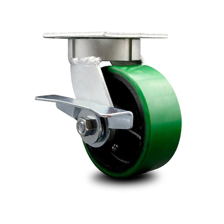 Kingpinless Polyurethane on Cast Iron Swivel Top Plate Caster w/5" x 2" Green Wheel & Side Lck Brake - 900 lbs Capacity/Caster - Service Caster Brand
