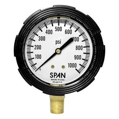 'Pressure Gauge, General Purpose, 2-1/2 In., Basic Gauge Case Material Plastic, Basic Gauge Wetted Parts Brass / Bronze, 1/4 In., MNPT, Gauge Connection Location Bottom, 0 to 1000, psi, +/-3-2-3 Percent, Gauge Panel Mountable No, Liquid Filled Yes, Gauge Primary Range Smallest Graduation 10, Gauge Case Material ABS Plastic, Gauge Primary Range Numbered Graduations 100, Gauge Case Color Black, Calibration Certificate Included No'