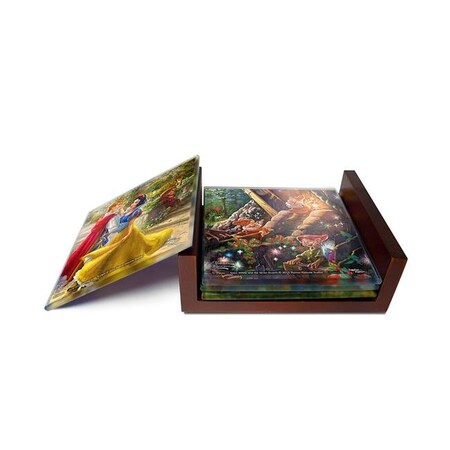 Each of these dazzling, durable StarFire Prints Glass Coasters features a vivid scene of Disney's Snow White, as imagined by Thomas Kinkade Studios. <b>StarFire Prints Glass Coasters<b> StarFire Prints glass coasters are photographic quality prints fused permanently into glass. Featuring artwork from your favorite movies, these coasters are an elegant way to display your fandom to the world. These images are permanently fused into the glass, resulting in a print that captures the natural light, enhancing the color display and making each image a true piece of art. <br><br> Comes with stylish, modern wooden holder.
