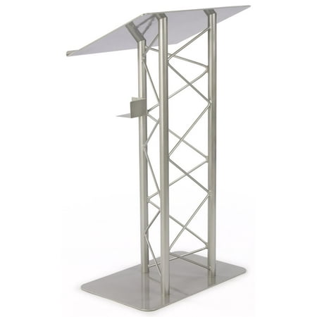 <ul> <li>Modern truss-like design is stylish yet sturdy.</li> <li>Cup holder is just large enough to hold a small cup or other accessories during a presentation.</li> <li>Aluminum tubing and steel base and top are durable and long-lasting.</li> </ul>