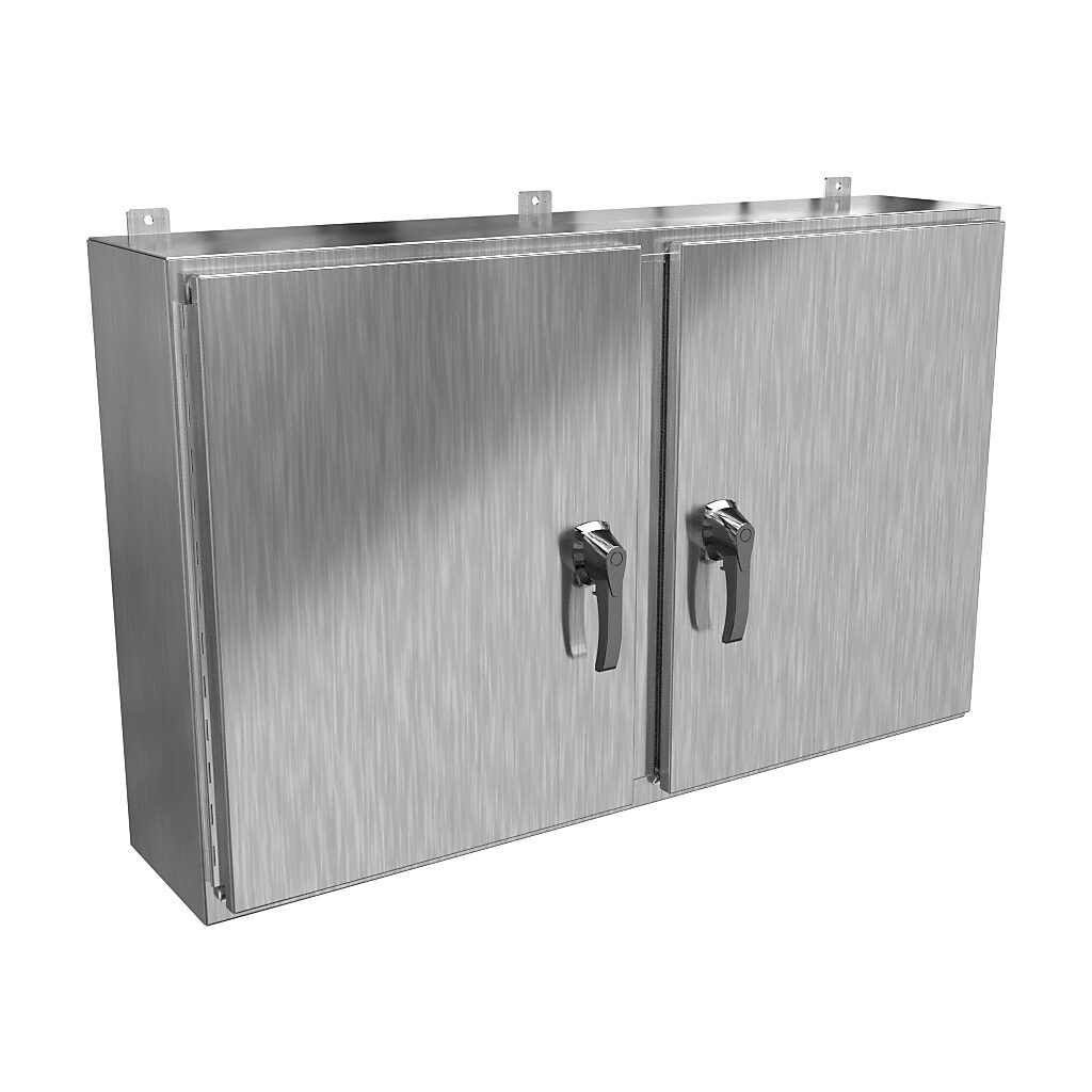Hammond Double-door wallmount enclosure has 12-gauge 304 stainless steel construction with smooth and continuously welded seams to provide enhanced durability. It measures 10 Inch x 47.992 Inch x 30 Inch. Enclosure has doors with heavy gauge continuous hinges and 3-pt padlocking handle. It includes seamless poured-in place gasket. Enclosure has detachable center post to offer easy inner panel setup. It has a grounding stud and bonding stud on the door.Enclosure and cover are made of natural stai