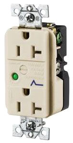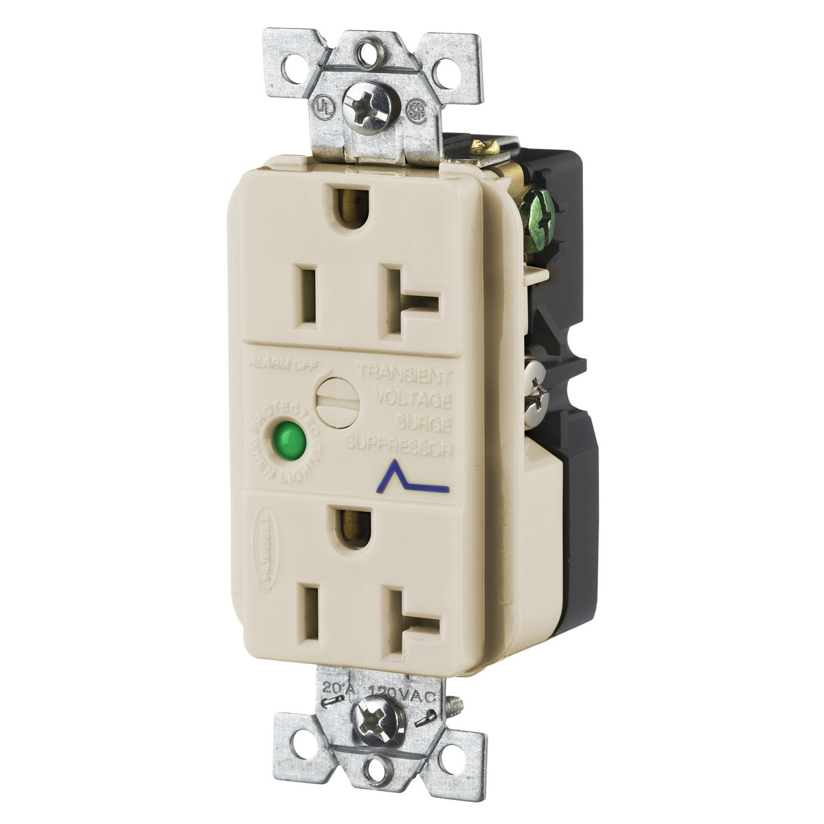 Hubbell HBL5362ALSA Spike Shield Circuit Guard Specification Grade Surge Suppression Duplex Receptacle with Light and Alarm, 125V AC, 60Hz, 20A, 2 Pole, 3 Wire, Almond