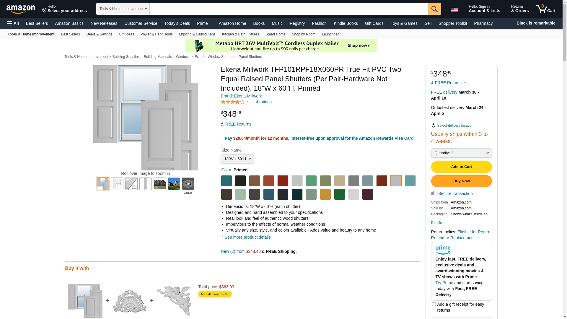Ekena Millwork TFP101RPF18X060PR True Fit PVC Two Equal Raised Panel Shutters (Per Pair-Hardware Not Included), 18"W x 60"H, Primed, 7 Sq Ft