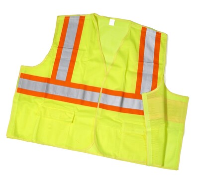 Mutual 16386 High Visibility Polyester ANSI Class 2 Mesh Tearaway Safety Vest with Pockets and 4" Orange/Silver/Orange Reflective Tape, 4X-Large, Lime