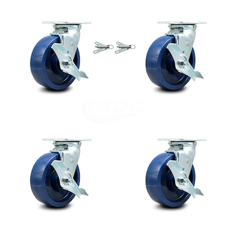 Solid Polyurethane Swivel Top Plate Caster Set of 4 w/6" x 2" Blue Wheels-Includes 2 Swivel with Brakes and Bolt on Swivel Locks & 2 Swivel with Brakes-4800 lbs Total Cpty-Service Caster Brand
