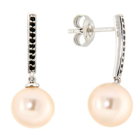 These beautiful earrings feature round orange freshwater pearls and sparkling round-cut black spinel stones The stones are set into highly polished sterling silver The earrings measure 24 mm long and 9 mm wide Post style with friction back.