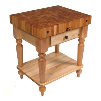 John Boos Rustica Butcher Block Table with solid shelf and easy-glide drawer(s). 4-in. end-grain maple butcher block top. 30"L x 24"D.