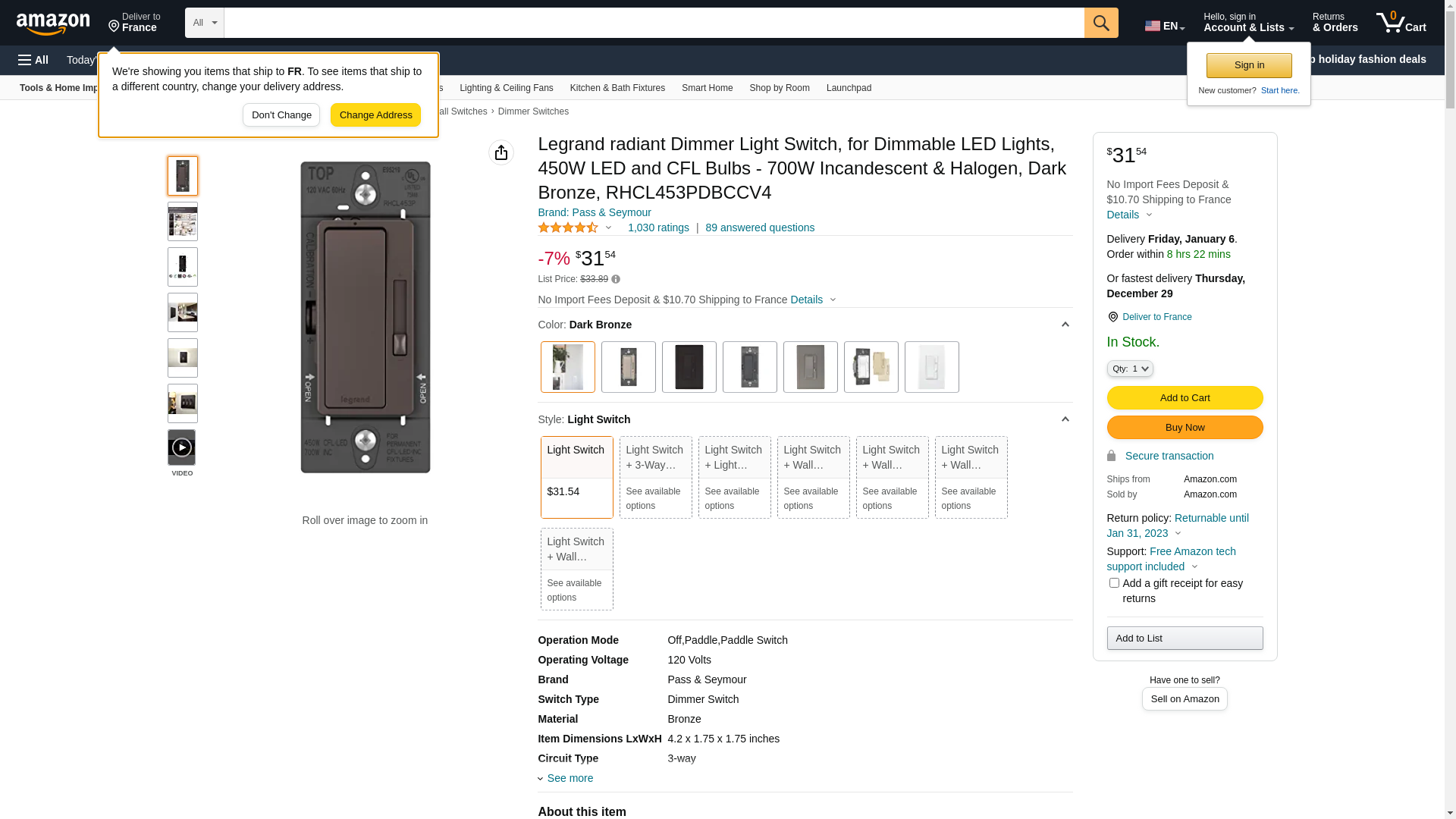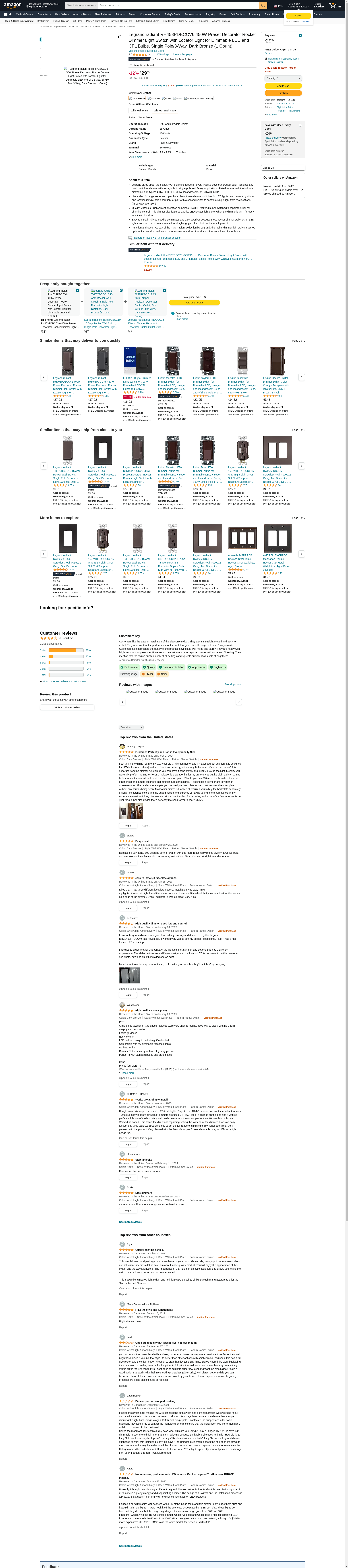 - Included - 1 Legrand - Pass & Seymour Radiant dark bronze rocker dimmer light switch with LED locator, 10 amps, 120 volts, rocker dimmer switches for LED lights