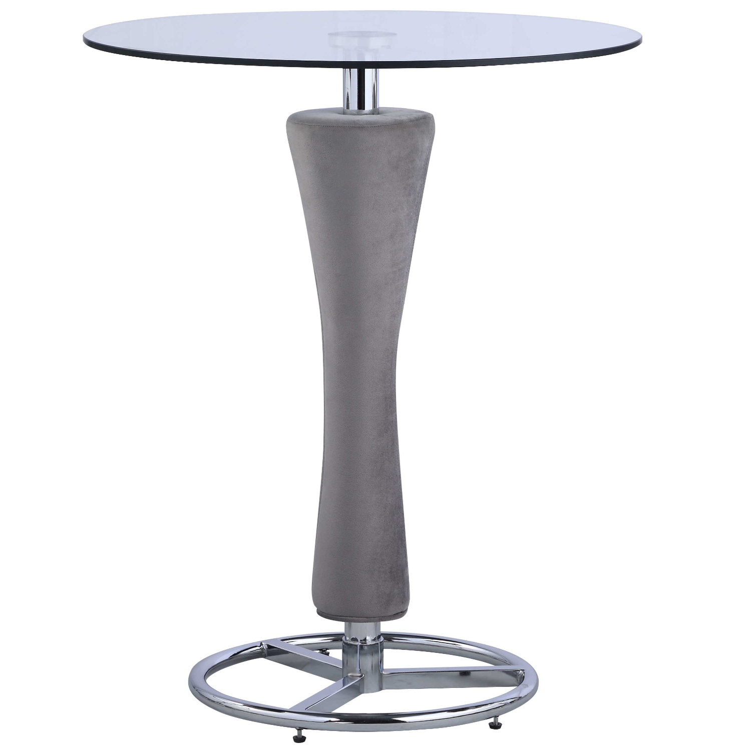This contemporary pub table features a round, clear tempered glass top on a chrome pedestal with a cushioned pedestal upholstered in gray fabric and an open wheel chrome base.