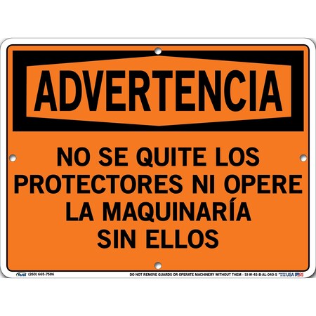 Vestil SI-W-45-B-AL-040-S DO NOT REMOVE GUARDS OR OPERATE MACHINERY WITHOUT THEM/NO SE QUITE LOS PROTECTORES NI OPERE LA MAQUINARÍA SIN ELLOS Warning Sign, Aluminum, 0.040" Overall Size, 12.5"Wx9.5"H