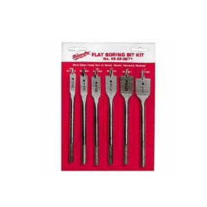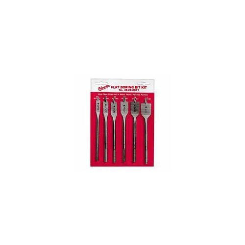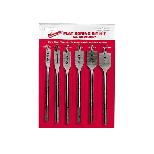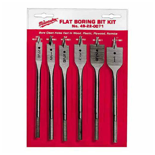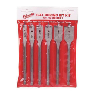 Milwaukee 49-22-0071 6 Piece Flat Boring Bit Kit NEW For fast, small hole drilling in wood, count on Milwaukee's premium quality Flat Boring Bits. Made of heat treated High Carbon steel, the Flat Boring Bit bores clean holes at any angle in wood, plastic, plywood and Formica. The drill point and cutting edges can be resharpened often for economical hole drilling. Bit offers a 6 inch drilling depth but can be used with 12 inch extension, 48-28-3350, for extended deep hole drilling. Consists of six of the most popular size bits: 3/8 in., 1/2 in., 5/8 in., 3/4 in., 7/8 in., and 1 in. 6 bits: 3/8 in., 1/2 in., 5/8 in., 3/4 in., 7/8 in., and 1 in. 1/4 in. shank diameter 6-1/16 in. overall length Drill point and cutting edges can be resharpened Contains six popular size flat boring bits in heavy protective plastic: 3/8" - 1/2" - 5/8" - 3/4" - 7/8" - 1"