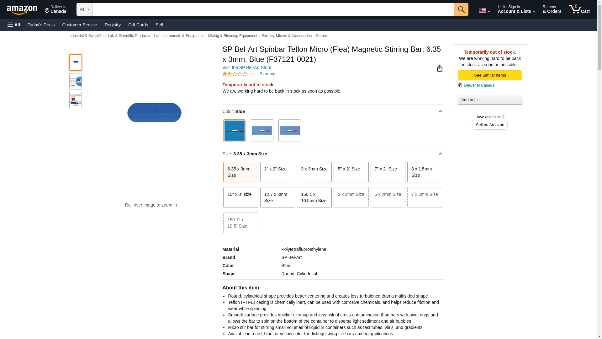 SP Bel-Art Spinbar Teflon Micro (Flea) Magnetic Stirring Bar; 6.35 x 3mm, Blue (F37121-0021)