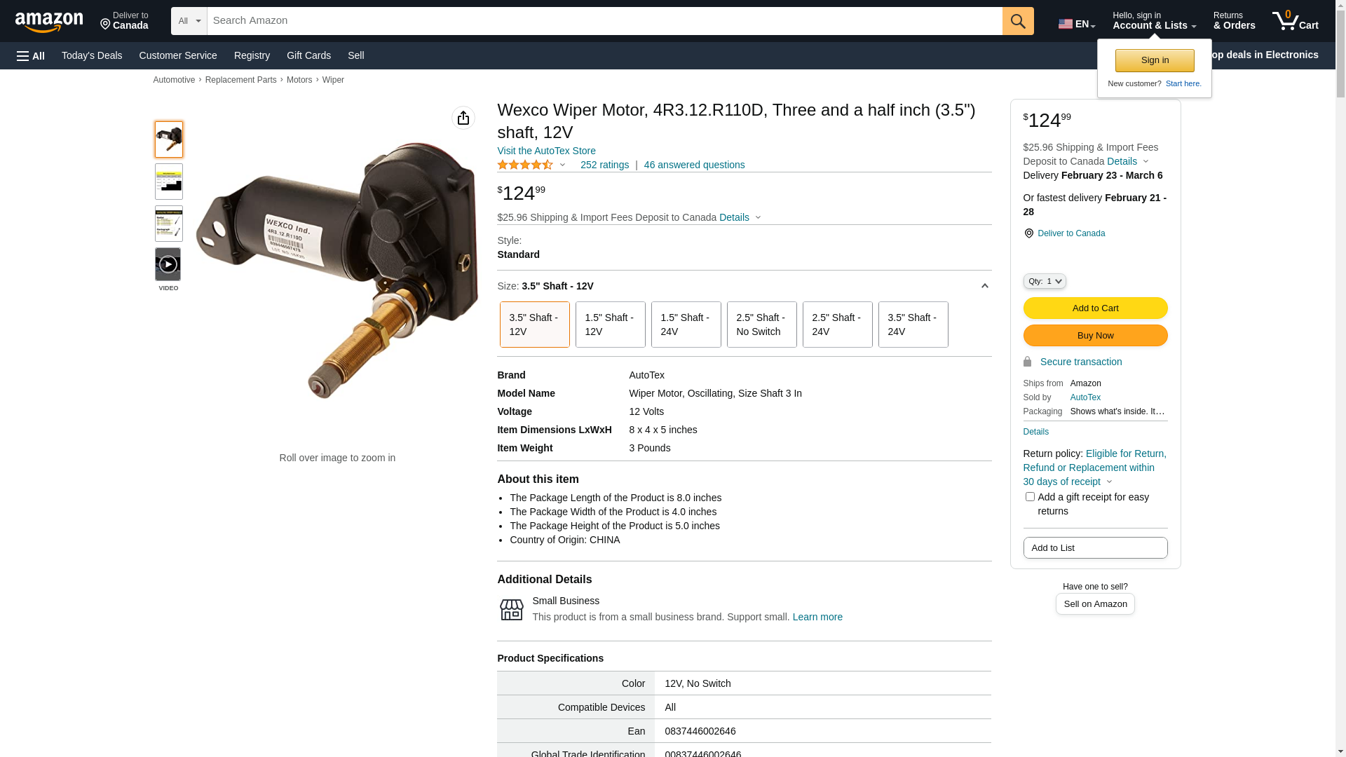 Wexco Wiper Motor, 4R3.12.R110D, Three and a half inch (3.5") shaft, 12V