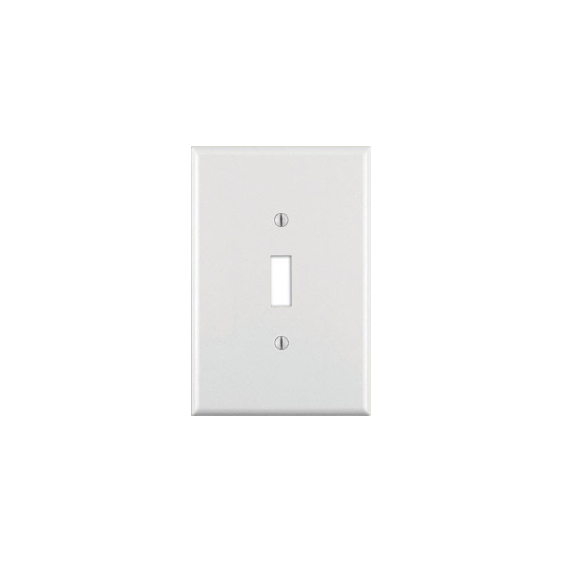 Leviton 1 gang White Thermoset Plastic; Color: White; Number of Gangs: 1 gang; Material: Plastic; Wall Plate Style: Toggle; Number in Package: 1 pk; Product Type: Wall Plate; Number of Switch Openings: 1; Height: 5-1/4 in.; Shape: Rectangle; Width: 3-1/2 in.; Plate is Oversized; Discovery ACC, CON, NBR, SUP, EXP