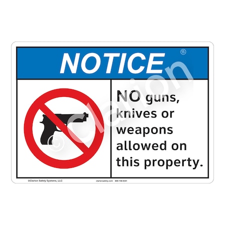 <p><strong>Word Message: </strong><br />NO guns, knives or weapons allowed on this property. </p><p><strong>Description: </strong><br />Clarion Safety Systems brings you high quality notice no guns safety signs (ITEM# F1104-) which are produced on premium plastic material and are expertly designed to meet your surveillance and other prohibition sign needs. </p><p><strong>Material Information:</strong></p> <ul> <li><strong>Material</strong>: (BJ) Indoor/Outdoor Plastic</li> <li><strong>Base Materials</strong>: .060" Rigid White Plastic</li> <li><strong>Overlaminate</strong>: none</li> <li><strong>Mounting Option</strong>: Mounting holes</li> <li><strong>Application</strong>: Indoor/Outdoor</li> <li><strong>MaxTemp</strong> (F): 140</li> <li><strong>MinTemp</strong> (F): 32</li> <li><strong>Chemical Resistance</strong>: Good</li> <li><strong>UV Resistance</strong>: Good</li> <li><strong>Outdoor durability</strong>: Good</li> <li><strong>Storage Stability</strong>: Stable. Optimum storage conditions: 72 F @ 50% relative humidity</li> <li><strong>Expected Life Indoor</strong>: Long term</li> <li><strong>Expected Life Outdoor</strong>: 3-5 year (expected outdoor life may vary due to climatic conditions)</li> <li><strong>RoHS</strong>: Yes</li> <li><strong>CRoHS</strong>: Yes</li> <li><strong>REACH</strong>: Yes</li> </ul>