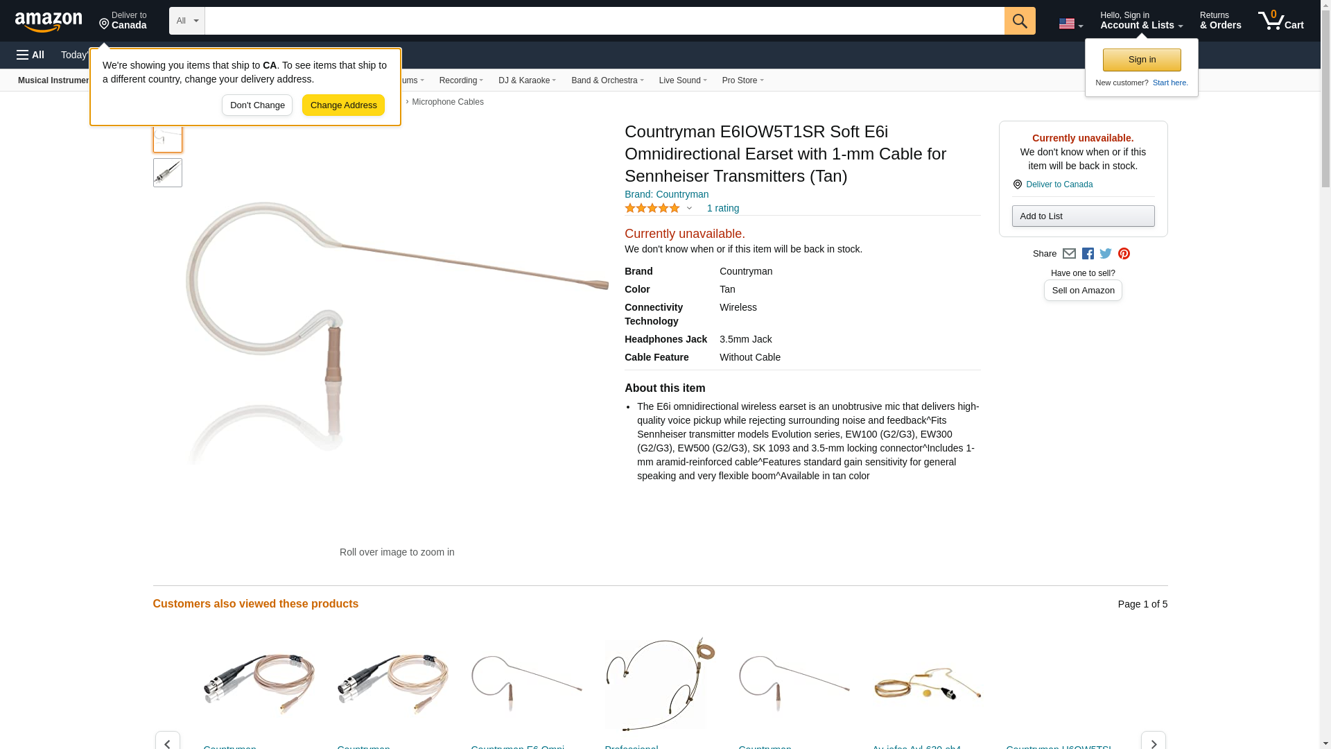 Countryman E6IOW5T1SR, Sennheiser:, (I) Very flexible boom, (O) Omnidirectional, (W5) Standard gain for general speaking, (T) Tan, (1) 1mm aramid-reinforced cable, E6 Earset Mic