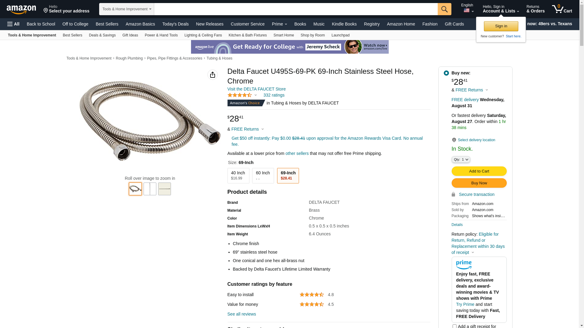 Delta U495S-69-PK 69 Inch Stainless Steel Hose 69" stainless steel hose One conical and one hex all-brass nut Lifetime Faucet and Finish Warranty Available Finish: Chrome: U495S-69-PK SKU: U495S-69-PK U495S69PK