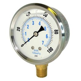 PIC Gauges PRO-201L-254E 0-100 PSI Pressure Gauge, 2 1/2" Dial, 1/4" Male NPT Connection, Bottom Mount, Dual Scale, Glycerin Filled, Stainless Steel Case/Bezel, Brass Internals & Plastic Lens
