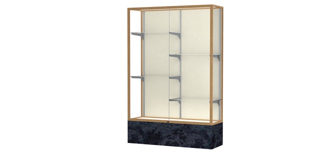572PB-GD-SS Case Backing: Plaque Fabric, Base Color: Silver Swirl, Frame Color: Champagne Gold Features: -Monarch Series collection. -Cases have an uncommon look for a great way to house your extraordinary accomplishments. -Anodized aluminum framing secures the sliding tempered glass doors and built-in locks. -Comes with interior lighting for added emphasis. -Made in the USA. Product Type: -Trophy display case. Lighting Available: -Yes. Design: -Floor standing. Display Material: -Glass. Country of Manufacture: -United States. Frame Material: -Metal. Adjustable Shelves: -Yes. -Lights not included. Dimensions: Overall Height - Top to Bottom: -72". Overall Width - Side to Side: -48". Overall Depth - Front to Back: -16". Overall Product Weight: -240 lbs. Base/Stand Height - Top to Bottom: -12".