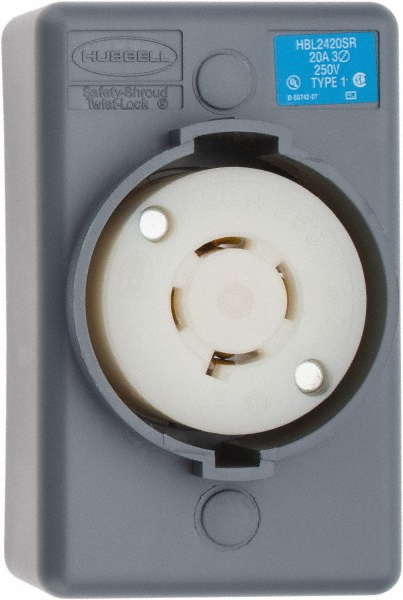 Install a Safety-Shroud Twist-Lock molded thermoplastic shroud to help eliminate any possible user contact with energized or partially connected plugs, and to keep blades from bending.<br /><br /> Item: Locking Receptacle<br /> Shrouded / Non-Shrouded: Shrouded<br /> Wiring Style: Standard<br /> Mounting Type: Surface Mount<br /> Grade: Industrial<br /> Material: Impact Modified PBT<br /> Amps: 20<br /> Voltage: 250VAC<br /> Number of Poles: 3<br /> Number of Wires: 4<br /> Color: Gray<br /> NEMA Configuration: L15-20R<br /> NEMA Rating: 4, 4X, 12<br /> IP Rating: 20<br /> Phase: 3<br /> HP: 3.0<br /> Standards: UL/CSA<br /> Special Features: Corrosion Resistant