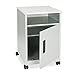 Sleek design fits neatly into smaller areas. Steel stand has a durable powder coat finish and a scratch resistant laminate top. Single-door enclosed cabinet for supply storage and fixed interior shelf. Open area under top for frequently accessed materials. Storage pocket inside door for manuals. Mobile on four casters (two locking).