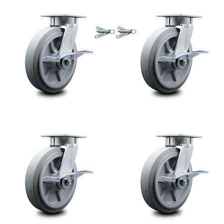 Kingpinless Thermo Rubber Flat Tread Swivel Top Plate Caster Set 4 w/8' x 2" Gray Wheels-Includes 2 Swivel with Brakes and Bolt on Swvl Locks&2 Swvl with Brakes-2400lbs Total Cpty-Service Caster Brand