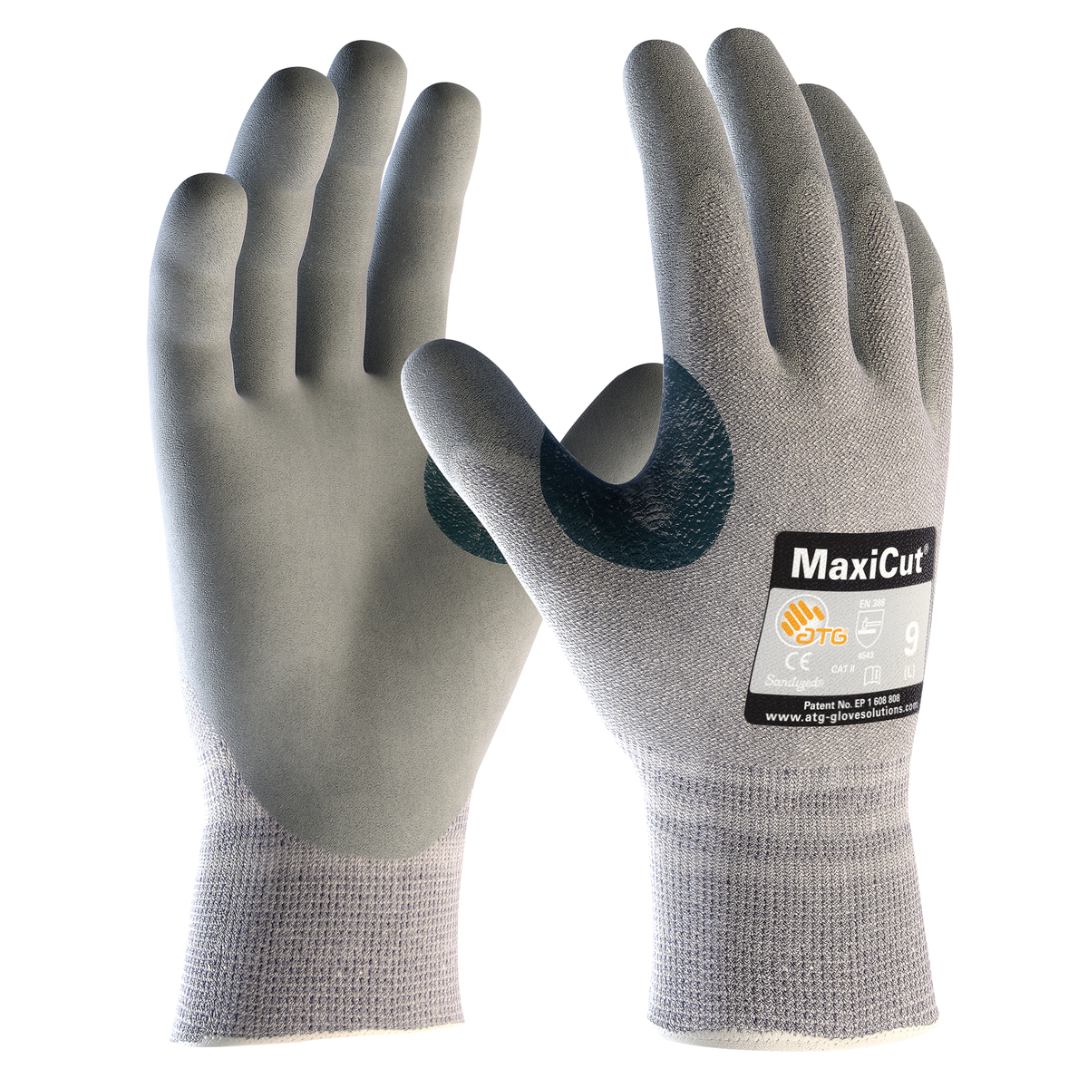 Protective Industrial Products 2X MaxiCut 5 By ATG Cut Resistant Gray MicroFoam Nitrile Palm And Fingertip Coated Work Gloves With Gray Seamless Nylon, Dyneema, Glass And Lycra Liner And Continuous Knit Cuff. MaxiCut 5 by ATG, Dyneema with engineered yarns, reinforced thumb crotch, MicroFoam nitrile palm/fingertip coating, heavy weight. (Purchase of 2 Pairs)