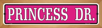 Princess Dr. Novelty Wood Mounted Small Metal Street Sign WB-K-1289. A 4" x 18" novelty aluminum small metal street sign mounted on a handcrafted wood border frame. This item is easy to hang with a nail or add a rope to give it a personal touch. This item will be shipped out within 24-48 hours of the order being placed. Our wood bordered frame is assembled with an elegant stained finish to highlight the selected plate in the middle. With over 1000 different signs to choose, there is bound to be one for you. This item is always be in stock and will not have to be backordered. Our products are proudly made in the U.S.A.