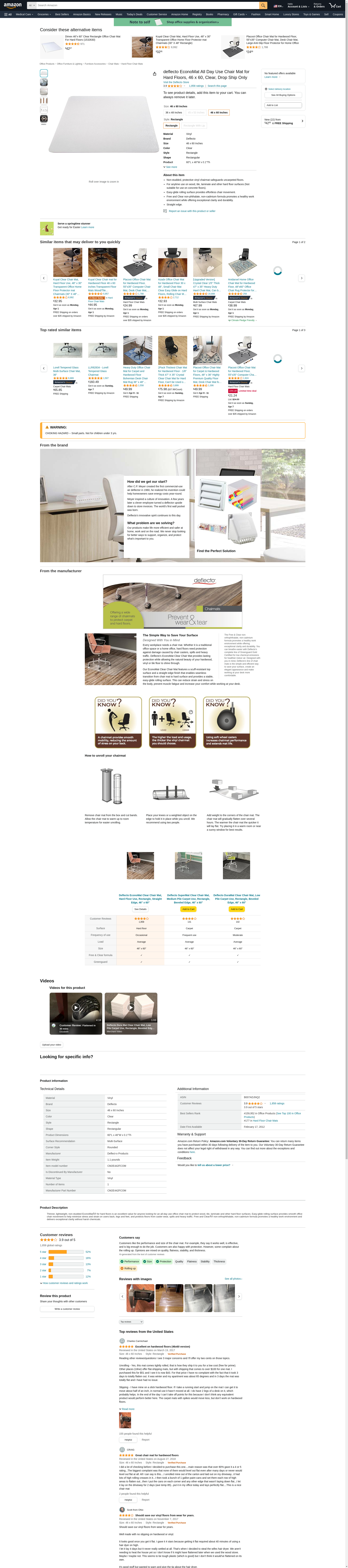 | Feature | Protective clear vinyl chairmat prevents wear and tear on your chair, while protecting hard floor surfaces such as hardwood, tile, laminate, linoleum or concrete |