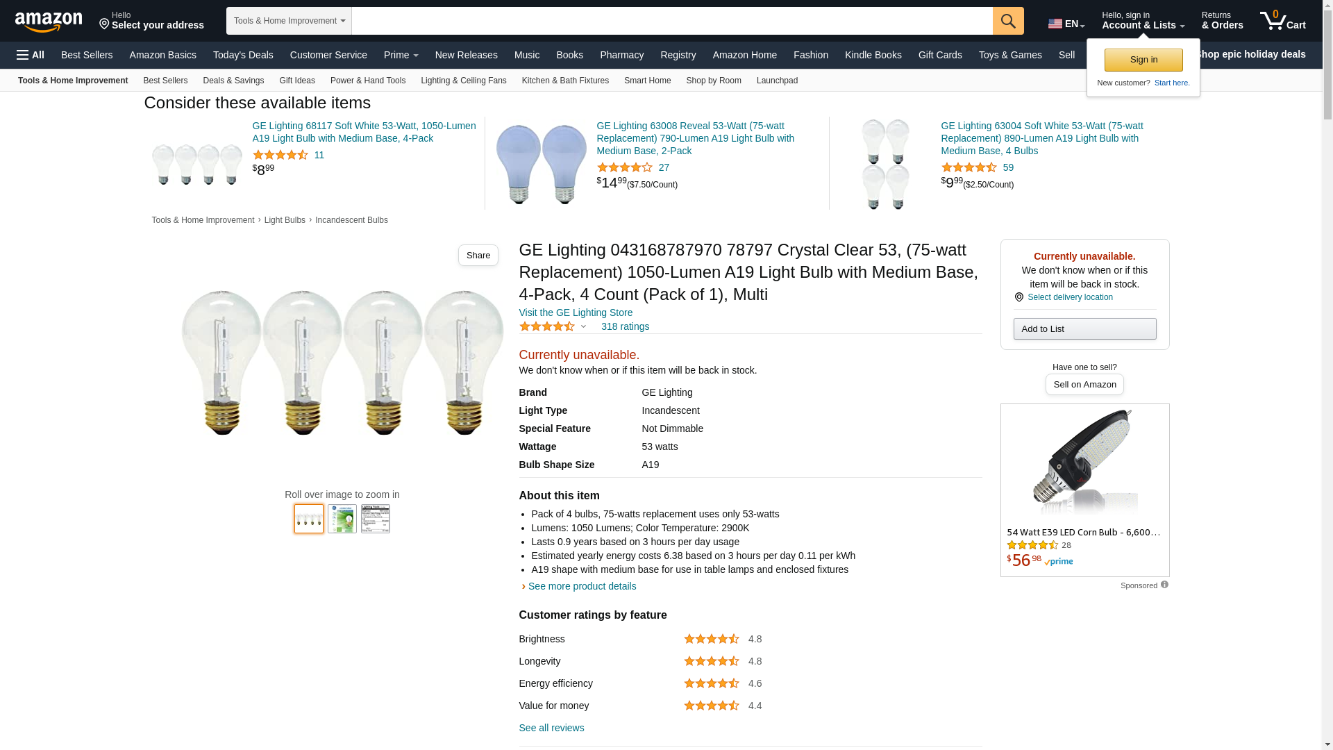 GE Lighting 043168787970 78797 Crystal Clear 53, (75-watt Replacement) 1050-Lumen A19 Light Bulb with Medium Base, 4-Pack, 4 Count: Maxedbuy.com