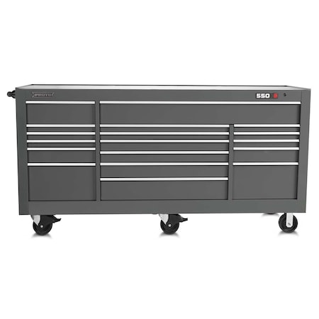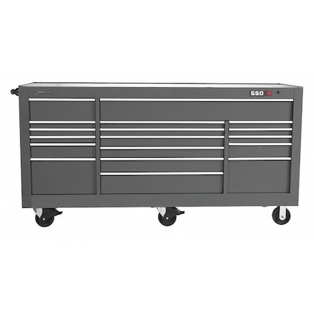Rolling Cabinet 550S Series Industrial Premium Width 88-1/4 In. Depth 27 In. Height 46-3/8 In. Number of Drawers 20 Gray Drawer Color Gray Drawer Capacity 400 lb. Ball Bearing Full Extension Drawer Slides Gloss/Matte Finish Storage Capacity 48 654 cu in. Load Rating 3600 lb. Caster Size 6 in x 2 In. Number of Shelves 0 Steel Bottom 14 Side 16 Drawers 18 Gauge Work Surface Material Steel Vinyl Caster Wheel Material Glass Filled Nylon