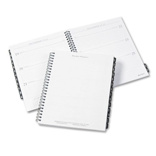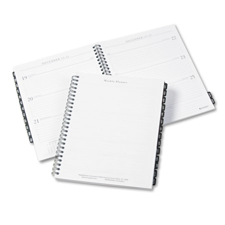 - Weekly: One week per two-page spread; hourly appointments, 8:00 a.m. - 5:00 p.m.; past, current and future months reference; space for notes