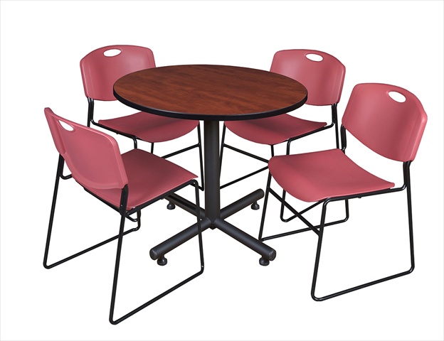 Regency TKB36RNDCH44BY 36 In. Round Laminate Table, Cherry & Kobe Base With 4 Zeng Stacker Chairs, Burgundy