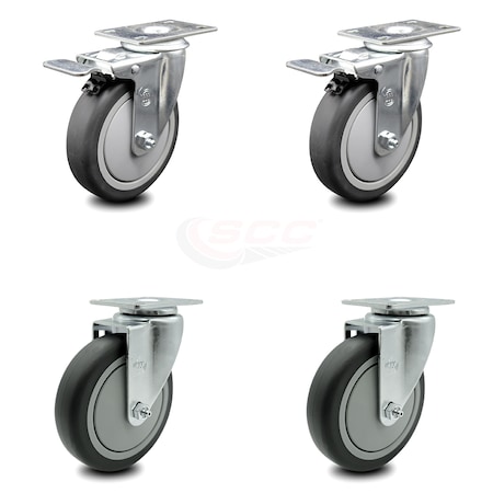 Thermoplastic Rubber Swivel Top Plate Caster Set of 4 with 5 Inch Gray Wheels - Includes 2 Swivel with Total Locking Brakes and 2 Swivel - 1200 lbs. Total Capacity - Service Caster Brand