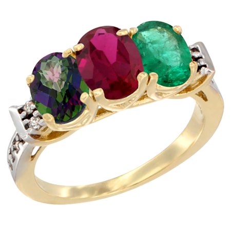 14K Yellow Gold Natural Mystic Topaz, Enhanced Ruby & Natural Emerald Ring 3-Stone Oval 7x5 mm Diamond Accent, sizes 5 - 10