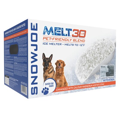 Melt away slippery ice and snow build-up this winter with MELT Pet-friendly Blend ? the cleaner, greener, yet equally as an effective deicing formula. A paw- and pet-friendly alternative to more harmful melting agents, MELT30PET-BOX is safer to handle, non-tracking, and formulated from nature?s ingredients. Unlike more harmful deicing agents, MELT Pet-friendly Blend, when used as directed, leaves no slimy residue behind, making it safer to use on grass, turf, around trees, and other vegetation. MELT30PET-BOX delivers fast, effective results with its unique, eco-friendly formulation, enhanced with CMA (calcium magnesium acetate) for de-icing down to -12o F (-25o C). So, when it comes to pets, paws, and snow ? Go With Joe: MELT Pet-Friendly Blend, from SNOW JOE.