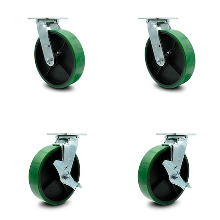 Polyurethane on Cast Iron Swivel Caster w/Main. Free Bearings Set of 4 w/8" x 2" Green Wheels - Includes 2 Swivel with Brakes & 2 Swivel - 5000 lbs Total Capacity - Service Caster Brand