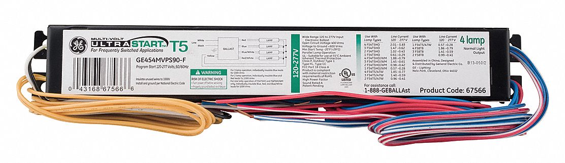 ' Electronic Ballast, Start Type Programmed, Lamp Type T5 Lamps, Ballast Family UltraStart(R), Number of Lamps 4, Voltage 120/277, Light Output Normal, Min. Starting Temp. -20 Degrees F, Amps AC 0.59 to 0.30, Input Watts 65 to 68 '