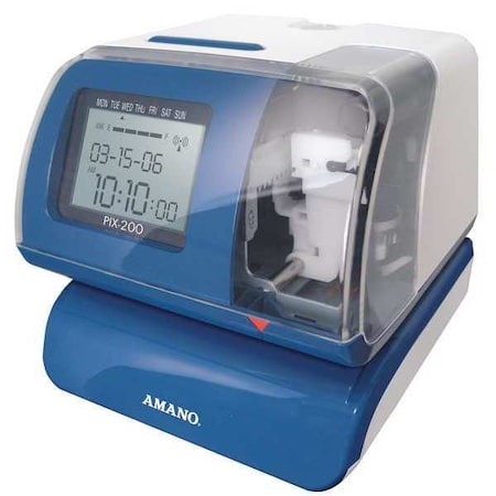 Amano PIX-200 Atomic Electronic Time Recorder & Date Stamp Amano PIX-200 Atomic Electronic Time Recorder & Date Stamp The PIX-200 is an all-in-one electronic time recorder and date stamp designed to meet the typical needs and special requirements of contemporary business. The PIX-200 includes a wide variety of standard features and offers a set of optional accessories with unique functions. The clock is great for use in applications from simple time and attendance tracking to more sophisticated computer communication and time synchronization. Features & Benefits: Atomic/radio controlled clock Ribbon ink capacity gauge 31 selectable preset imprint formats: prints year (2 or 4 digit), month, day, hour (AM/PM or 0-23), minutes (regular, 10ths, 100ths), seconds, 8-digit number and comments Customized comment imprint (up to 3 lines) Consecutive numbering with automatic reset function Many optional features Technical Specifications: Dimensions: 6.4"H x 6.3"W x 6.7"D Weight: 4.85 lbs. (not including operational battery, AC adapter) Power consumption: 100/120/230 VAC, 50/60Hz Ambient temperature: 14°F - 113°F Humidity: 10% - 90% (no condensation) Printing: Dot matrix Optional Features: Full power reserve (72 hours or 400 punches) External signal device, up to 20 weekly programs Ethernet LAN synchronization to NTP server USB communication for programming via software interface
