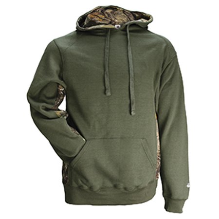 60% cotton, 40% polyester athletic fleece ; Two-ply hood with drawcord; Camo lining; Camo inserts on sides and sleeves; Front pouch pockets; Badger sport paneled shoulder for maximum movement;
