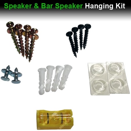 This Do-It-Yourself speaker hanging kit comes with everything you need(except a Phillips screwdriver) to hang speakers with keyholes like a pro. Using the kit properly, you can expect 30lbs of support in drywall and up to 100lbs in a stud. Pack of 4. The Speaker Hanging Kit contains: -4 Double Head Screws -2 Wall Marking Pins -1 Level -4 Rubber Pads -4 Anchors