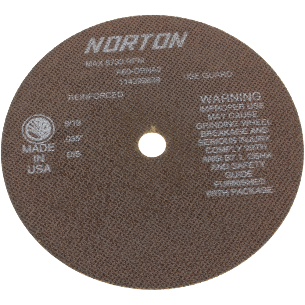 The NORTON fiber-reinforced tool room cut-off wheel is designed for use on fixed machinery and reengineered for maximum versatility in tool room cutting applications. Fiber reinforced for thin, straight, burr-free cutting on most steel applications. Wheel is reinforced for maximum safety. Used for cutting off drill bits, steel bars, and tubing; salvaging tools; and slotting work pieces.<br /><br /> Item: Abrasive Cut-Off Wheel<br /> Abrasive Wheel Type: Type 1<br /> Abrasive Wheel Diameter: 7"<br /> Thickness: 0.035"<br /> Arbor Hole Size: 5/8"<br /> Abrasive Material: Aluminum Oxide<br /> Abrasive Grit: 60<br /> Max. RPM: 8730<br /> Series: A60<br /> Diamond Knockout: No<br /> Application: Ferrous Metal, Gray Iron, Stainless, Aluminum<br />