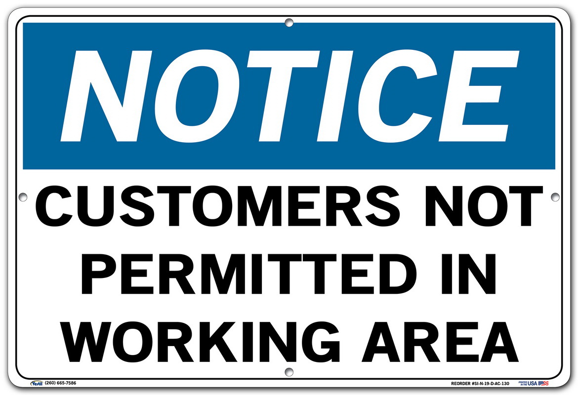 Vestil SI-N-19-D-AC-130 Notice Sign Aluminum Composite .130" Overall Size 18.5"W x 12.5"H Customers Not Permitted In Working Area , 12.5" Height, 18.5" Wide, 0.13" Length