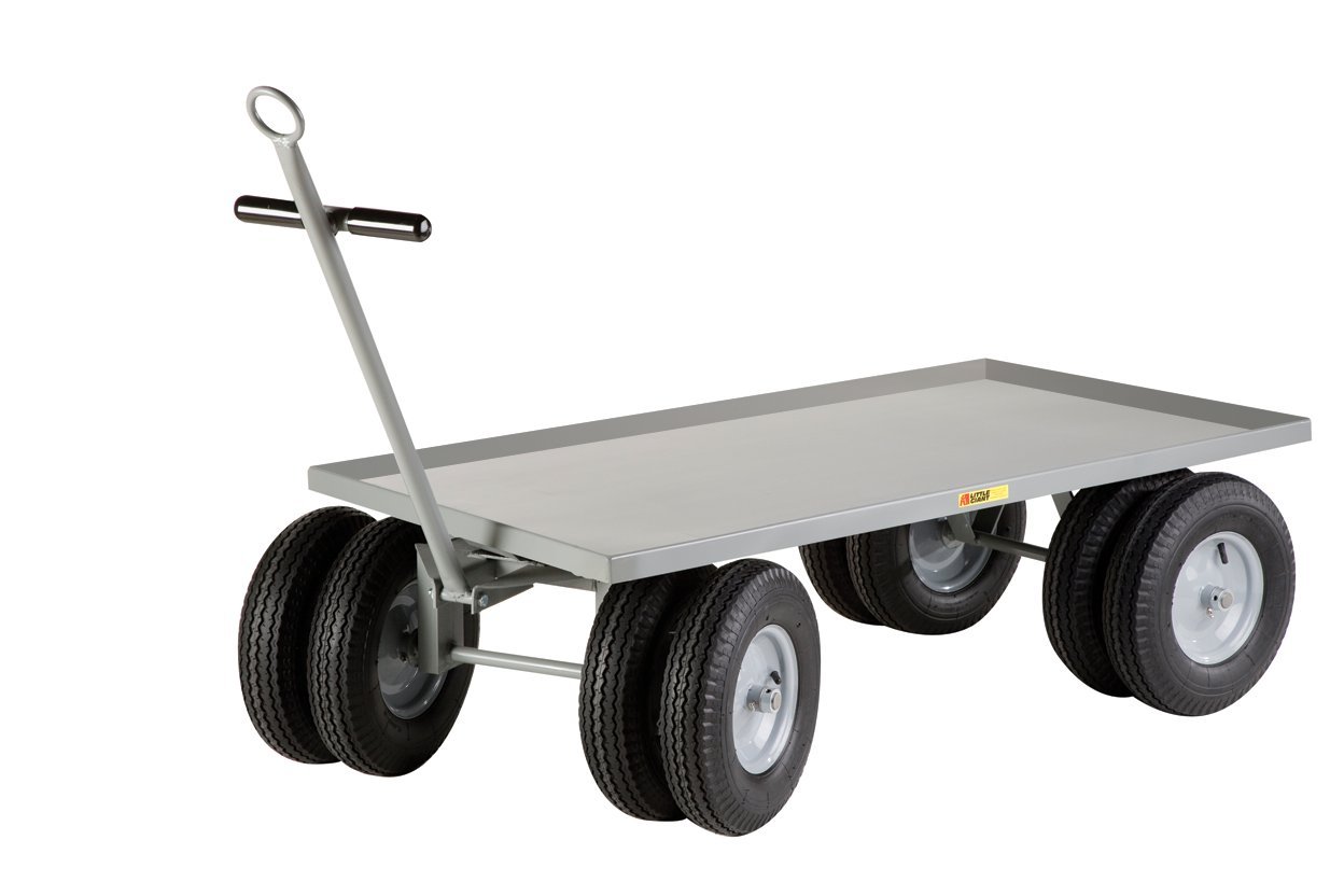 Little Giant lip edge 8-wheeler wagon truck. 8 Wheels distribute the load over greater surface area. 16-inches diameter by 4-inches width pneumatic wheels are 4 ply with roller bearings and 1-inch axles. 12 Gauge steel deck is comes with 1-1/2-inch retaining lip edge. Ring Drawbar/ T-Handle has 2-1/2-inches ID ring allows for intermittent low speed towing. Measures 60-inches length by 36-inches width. 3000 Pounds capacity. Pneumatic wheels features great cushion ride over rough floor surfaces, best option for traveling over small obstructions or outdoor applications. Best shock and vibration absorption. Like an automotive tire, an air filled rubber tire on a metal hub is able to easily roll over uneven surfaces and bumps but does require air pressure management. Under heavy loads, the pneumatic tire profile will compress creating greater rolling resistance. Pneumatic wheels are ideal for handling fragile loads over rough surfaces.