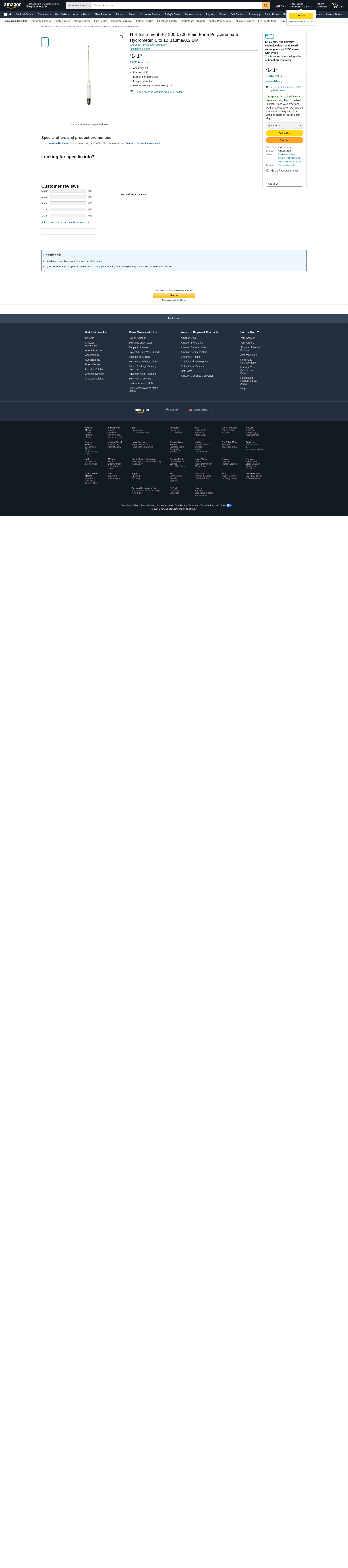 H-B Instrument B61800-0700 Plain-Form Polycarbonate Hydrometer, 0 to 12 Baume/0.2 Div