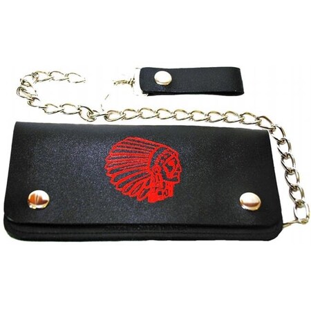 Features. Small front pocket for ID a deep zipper pocket for coins. A small compartment and deep back pocket for larger items.. Full flap with two snap closure.. Bi-fold chain wallet. Size - 7.5 x 3.5 in. with a 15 in. steel chain. Design - American Indian Red